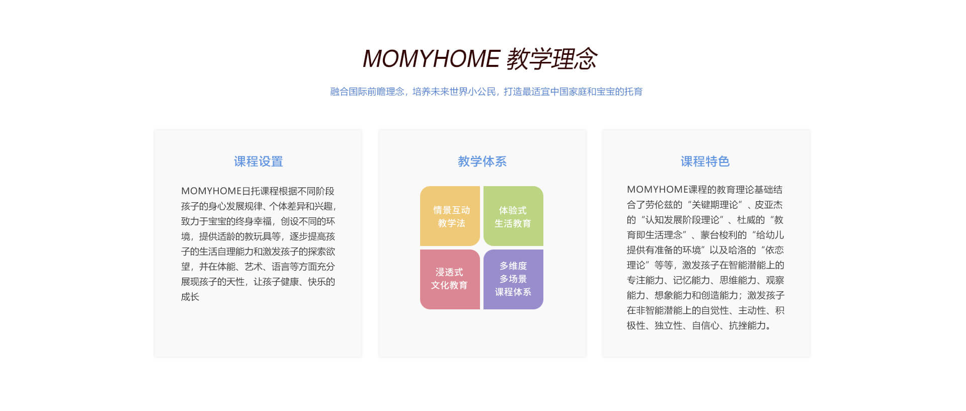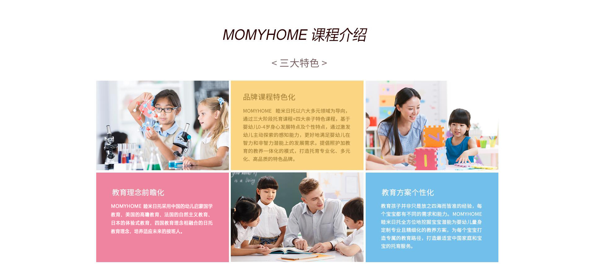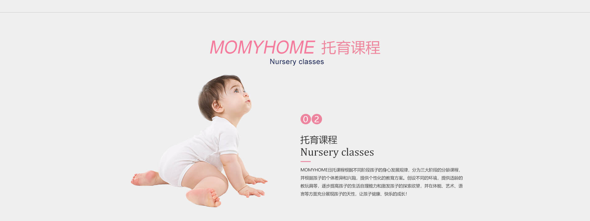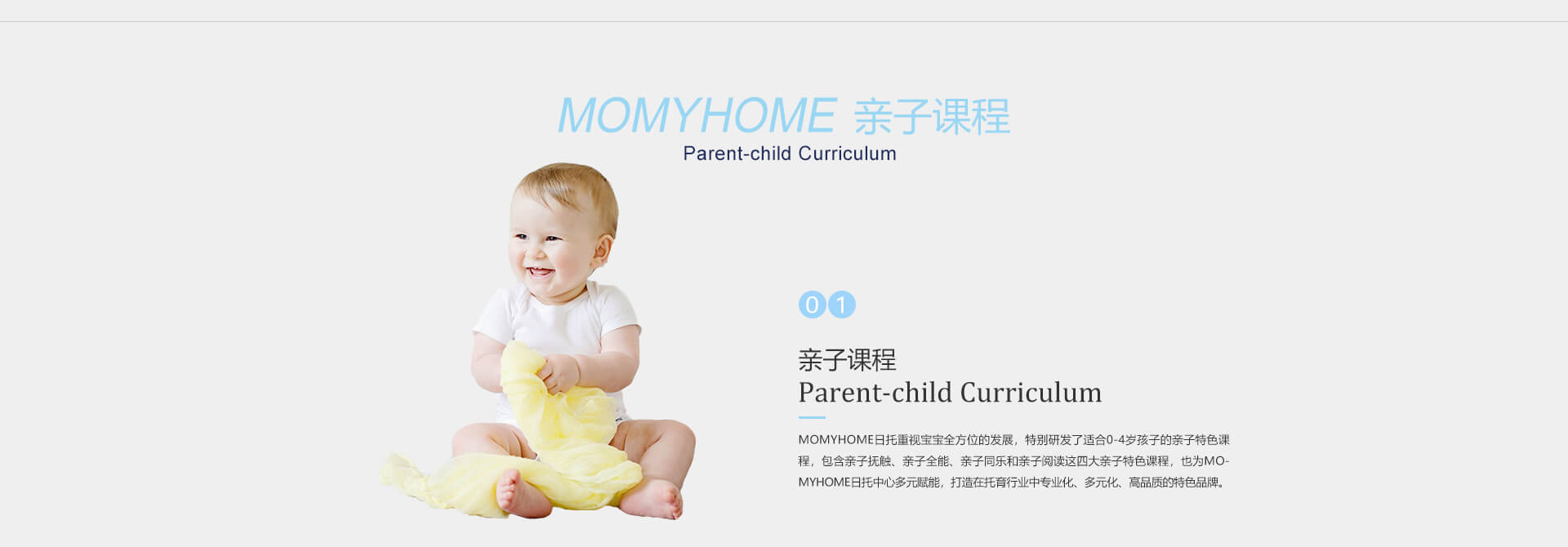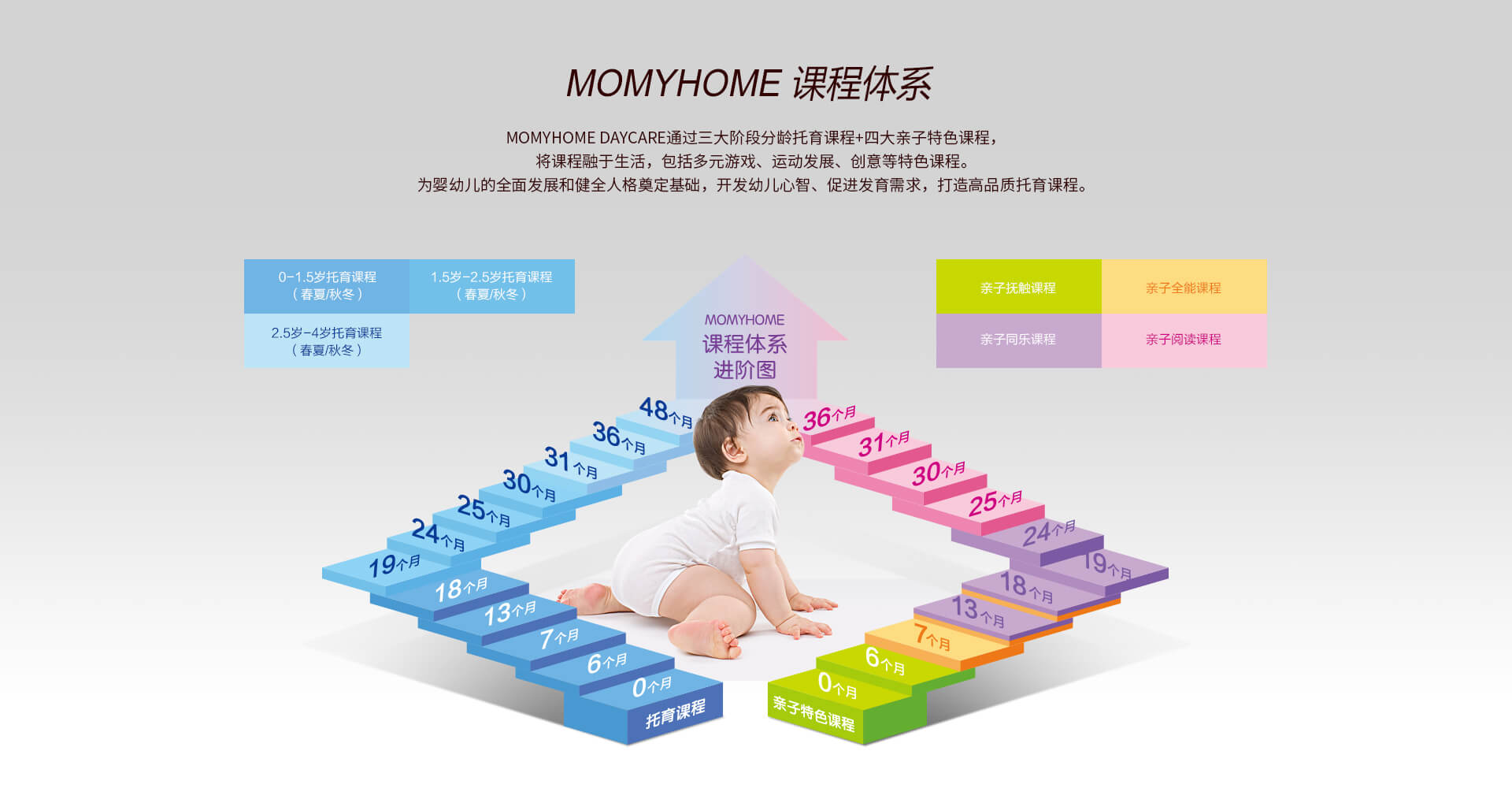 MOMYHOME日托重视宝宝全方位的发展,特别研发了适合0-4岁孩子的亲子特色课程,包含亲子抚触、亲子全能、亲子同乐和亲子阅读......