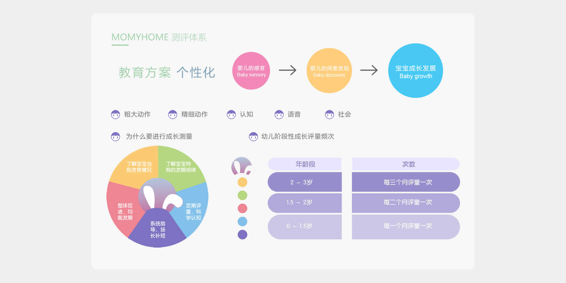 根据每个宝宝生长发育特点,追踪测评宝宝成长轨迹,围绕教学目标以及教养目标,制定适合宝宝的成长环境以及个性化养教方案......
